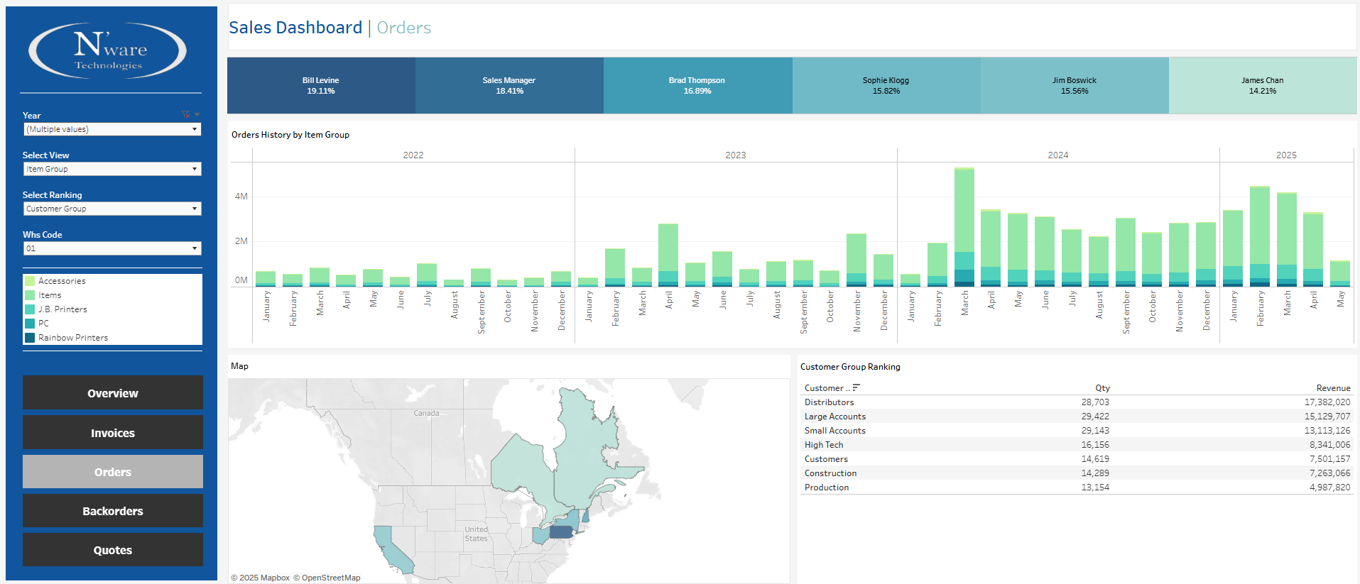 Supplier Inventory History and Current On-hand – Sales Quantity by Customer and Item Group – Customers by Geography